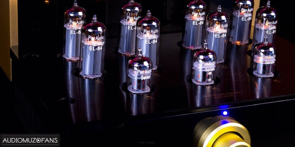 Na górze są transformatory w solidnej obudowie, co ogranicza wpływ innych urządzeń i przenoszenia drgań. Przed transformatorami znajdują się lampy – osiem lamp mocy – po cztery na kanał EL84 (dość rzadko stosowane we wzmacniaczach lampowych w domowym audio, częściej i z sukcesem we wzmacniaczach gitarowych ) w konfiguracji podwójnego układu push-pull, przed lampami mocy umieszczono dwie 12AU7 w sterowaniu oraz jedną 12AX7 na wejściu. Ta konfiguracja generuje moc na poziomie 20W na kanał (przy 8 Ohmach).