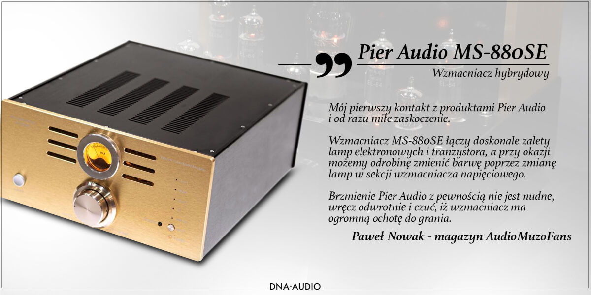 Mój pierwszy kontakt z produktami Pier Audio i od razu miłe zaskoczenie. Wzmacniacz MS-880 SE łączy doskonale zalety lamp elektronowych i tranzystora, a przy okazji możemy odrobinę zmienić barwę poprzez zmianę lamp w sekcji wzmacniacza napięciowego. Brzmienie Pier Audio z pewnością nie jest nudne, wręcz odwrotnie i czuć, iż wzmacniacz ma ogromną ochotę do grania. Dużą zaletą są tony średnie przepełnione muzykalnością, a gdy dodamy łatwość kreowania przestrzeni, mamy coś miłego na długie godziny słuchania bez zmęczenia. Doskonale sprawdza się w muzyce klasycznej i ciężkim brzmieniu, wszystko mieści się w harmonii i spójności przekazu, a poszczególne zakresy pasma są pieczołowicie i precyzyjnie zszyte. Jest jeszcze coś - otóż doskonale sprawdzi się z zespołami głośnikowymi, ale tymi ciut za jasno grającymi.